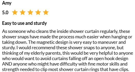 I’ve been using Shower Snaps™ in my own bathroom for nearly a year, refining and upgrading the design as I perfected each prototype. I created Shower Snaps™ to solve a problem I experienced myself — and I’m proud to finally share this solution with you.